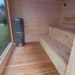 Moderne, ruime sauna met afmetingen 3×3 m, geschikt voor 7 personen.